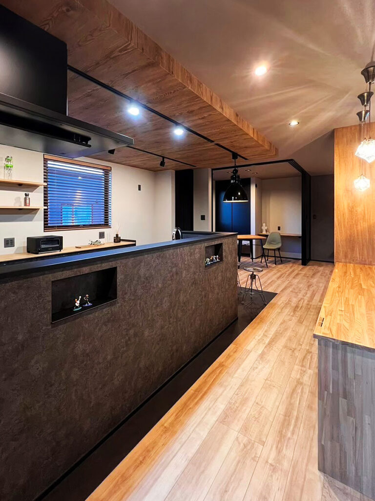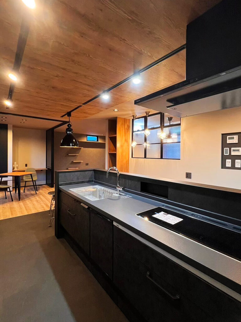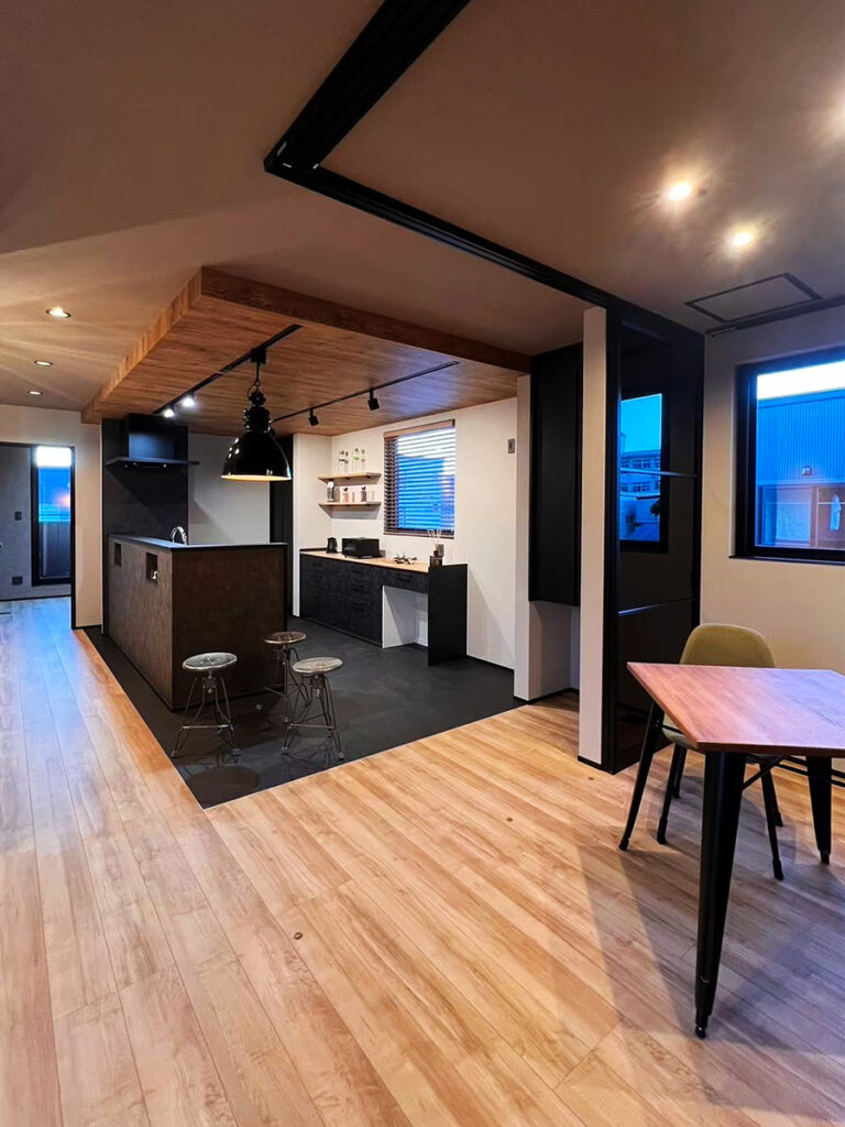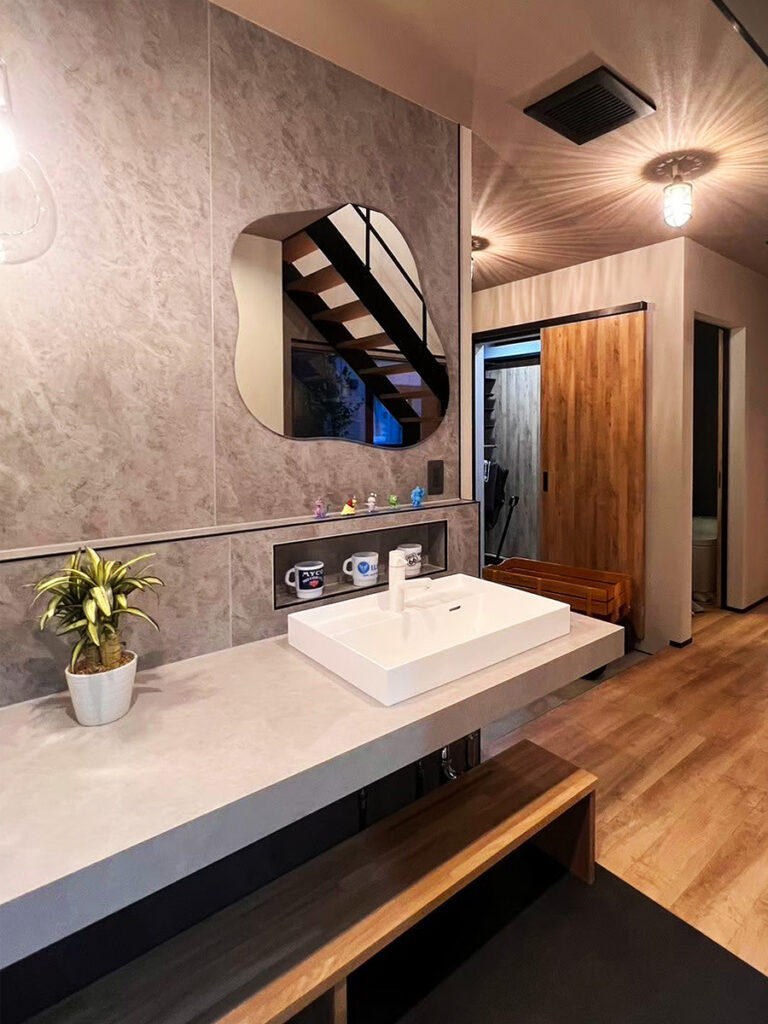 来客を魅了する縦長の土間玄関。グレーを基調とした造作洗面とこだわりのノンフレームミラーがホール空間を和らげます。広々とした2Fリビング。愛猫も日向でリラックスできるようキャットウォークと高窓を配置。
