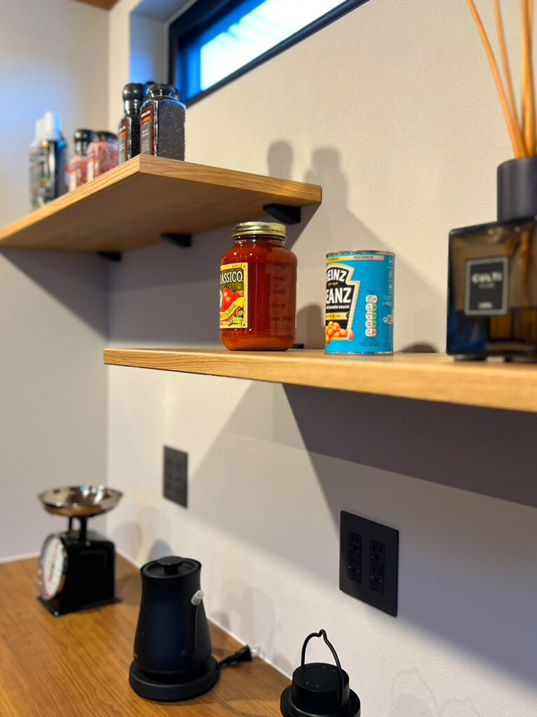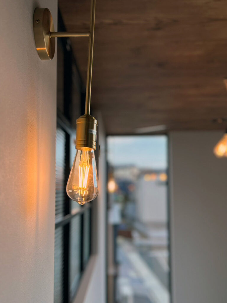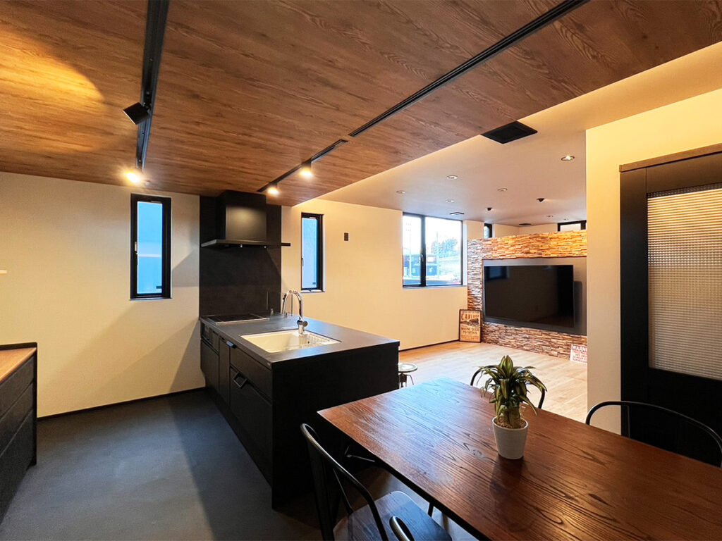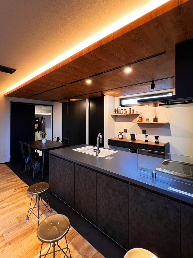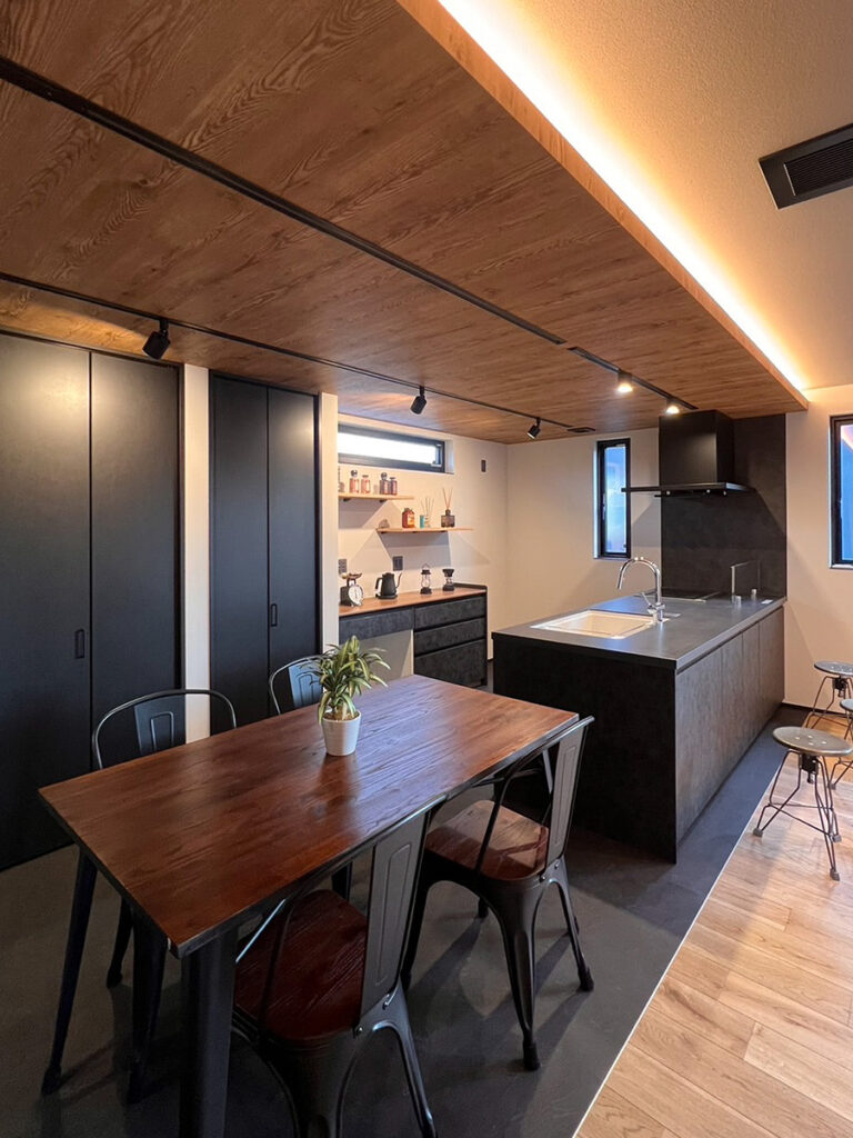 ダイニングキッチンに映える間接照明。リビングTV壁の裏側はオシャレなフリースペース。趣味の空間やお子様の勉強にぴったり。室内窓によりやさしい光が差し込みます。
