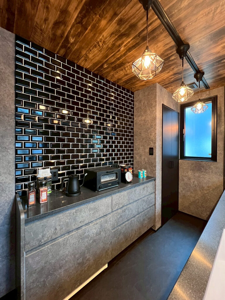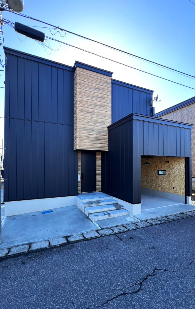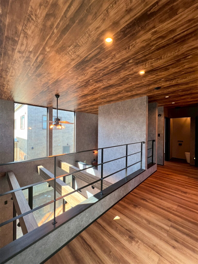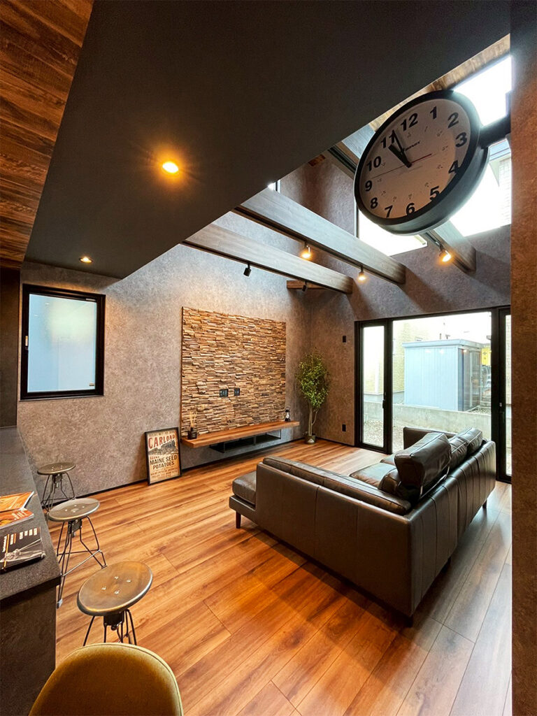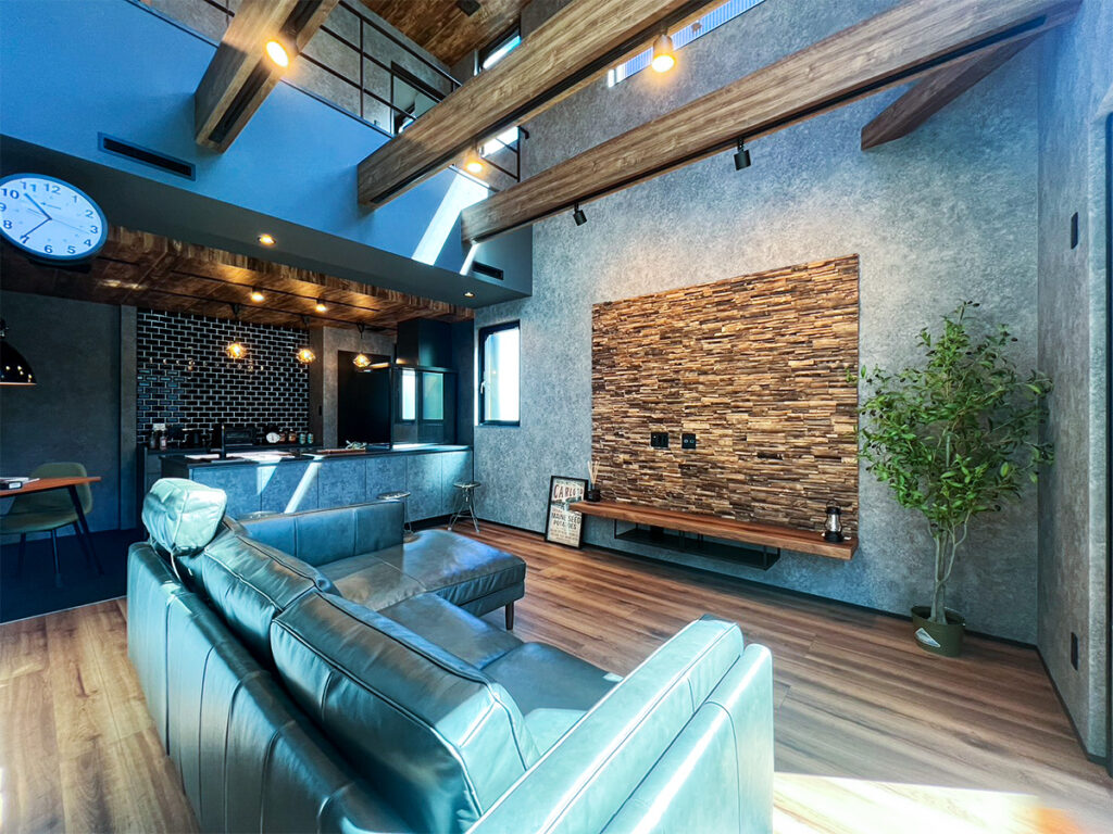 色彩豊かな木目のハワイアンコアのコントラストが引き立つ立体感あるファザード。ワイルドに仕上げたこだわりのビルトインガレージ。ブラックタイルローランシアが魅せる色づかいと立体的で重厚な造形が融合した男前ペニンシュラキッチン。異素材を組み合わせたアメリカンヴィンテージな住まいです。