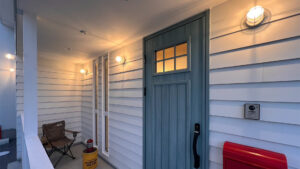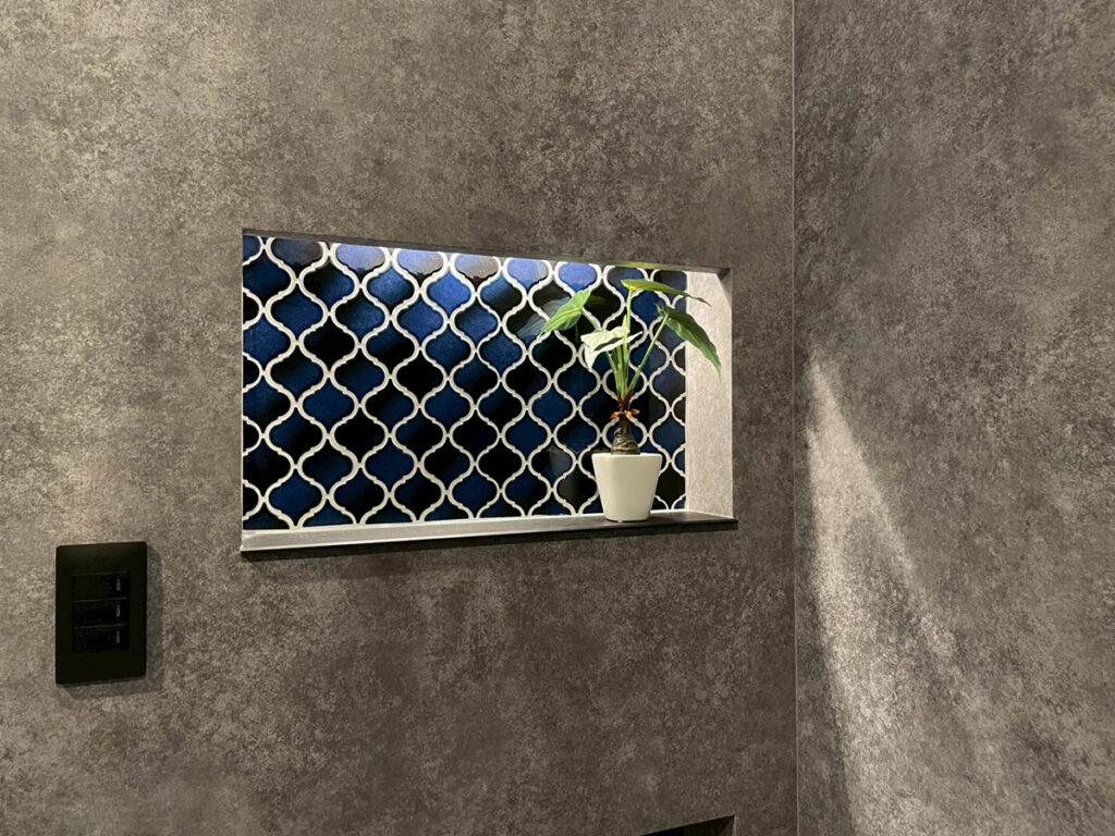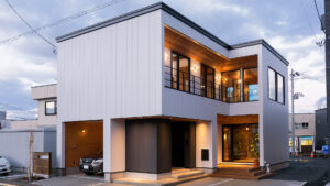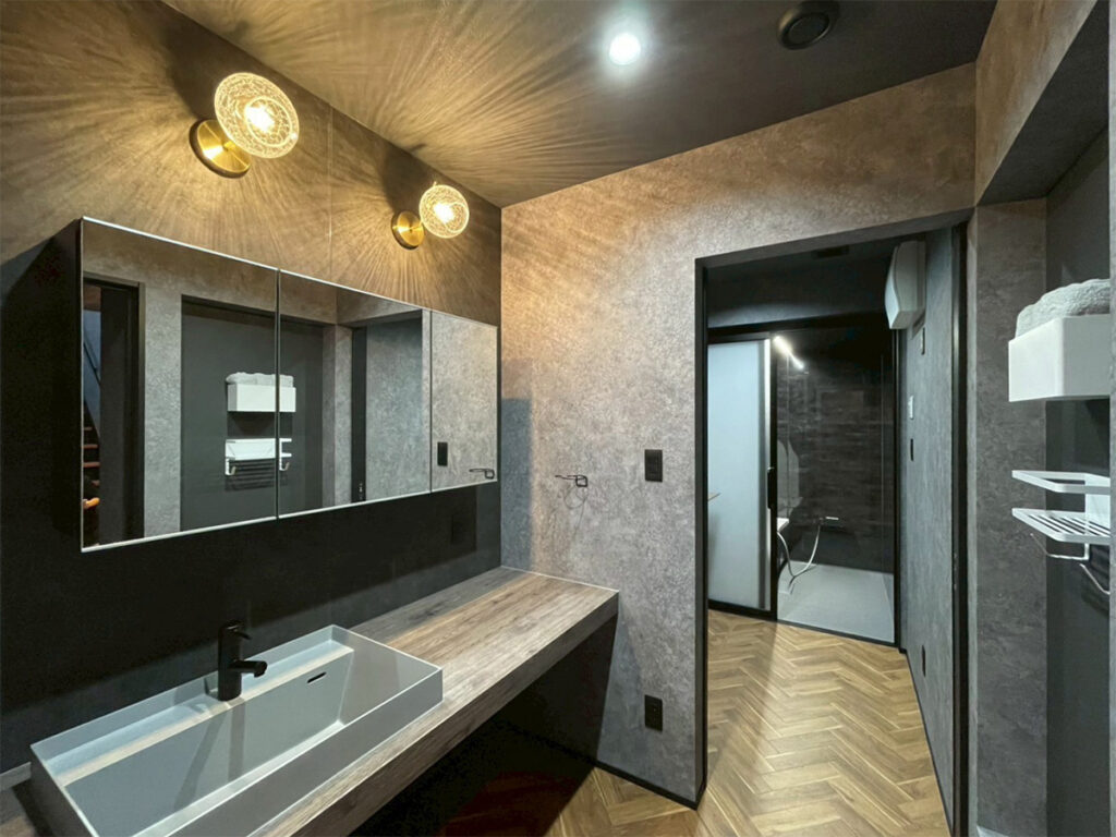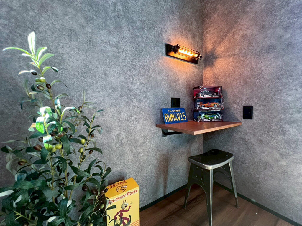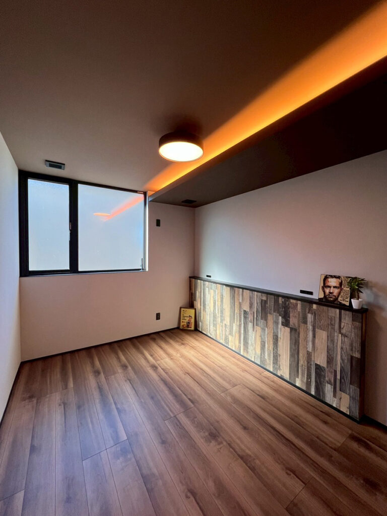 色彩豊かな木目のハワイアンコアのコントラストが引き立つ立体感あるファザード。ワイルドに仕上げたこだわりのビルトインガレージ。ブラックタイルローランシアが魅せる色づかいと立体的で重厚な造形が融合した男前ペニンシュラキッチン。異素材を組み合わせたアメリカンヴィンテージな住まいです。